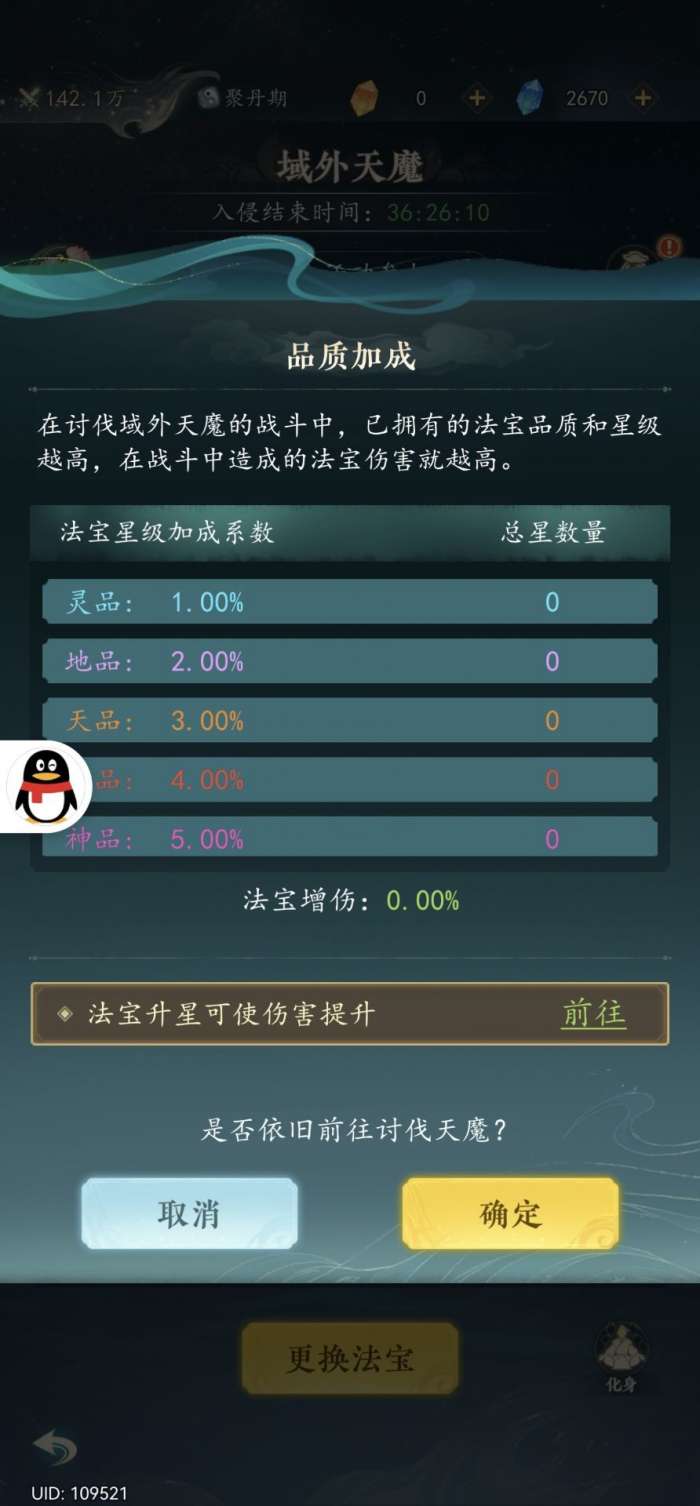 法宝品质跟星级的伤害加成,个人认为玩家前期主要养金色法宝升星就行红色法宝不要太多养不起。法宝是可以重置的所以不用担心养金色会浪费资源,因为这个活动的伤害加成是看品质跟星级的金色品质是性价比比较高的一个区间。