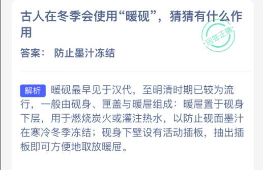 古人在冬季会使用“暖砚”,猜猜有什么作用?支付宝小鸡课堂开课啦!每天花一分钟答题赚饲料,喂喂小鸡就能贡献爱心啦!轻松又意义十足!2026年2月9日蚂蚁庄园的小鸡课堂题目正确答案是【防止墨汁冻结】,在寒冷的天气里,墨汁容易在砚台中结冰,导致书写困难。暖砚通过加热砚台,保持墨汁的流动性,以便文人能连续书写。