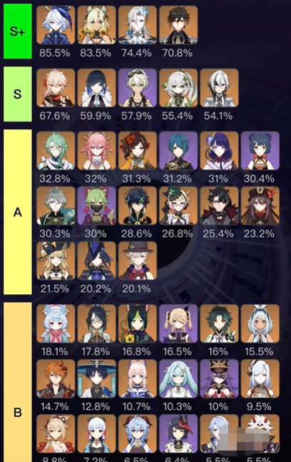 1、S+(综合):芙宁娜、希诺宁、那维莱特、万叶、钟离