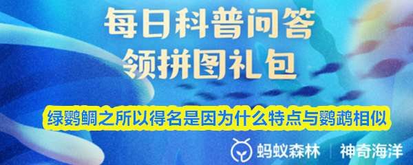 绿鹦鲷之所以得名是因为什么特点与鹦鹉相似?【神奇海洋】11月21日新题目已开答!正确答案现已公布,点击领取拼图,一起为修复海洋生态贡献力量!今日正确答案是:【嘴型和体色】。绿鹦鲷之所以得名是因为嘴型和体色与鹦鹉相似.