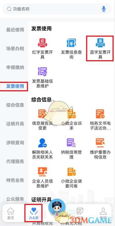1、纳税人以企业业务身份登录新电子税务局APP后,依次顺序点击【办&查】→【发票使用】→【蓝字发票开具】。