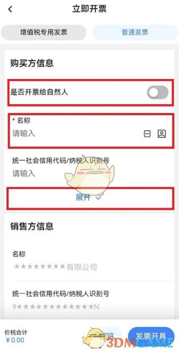 5、进入“立即开票”界面,填写发票信息(购买方信息、销售方信息、开票信息、备注信息、经办人信息),按照页面提示操作即可。