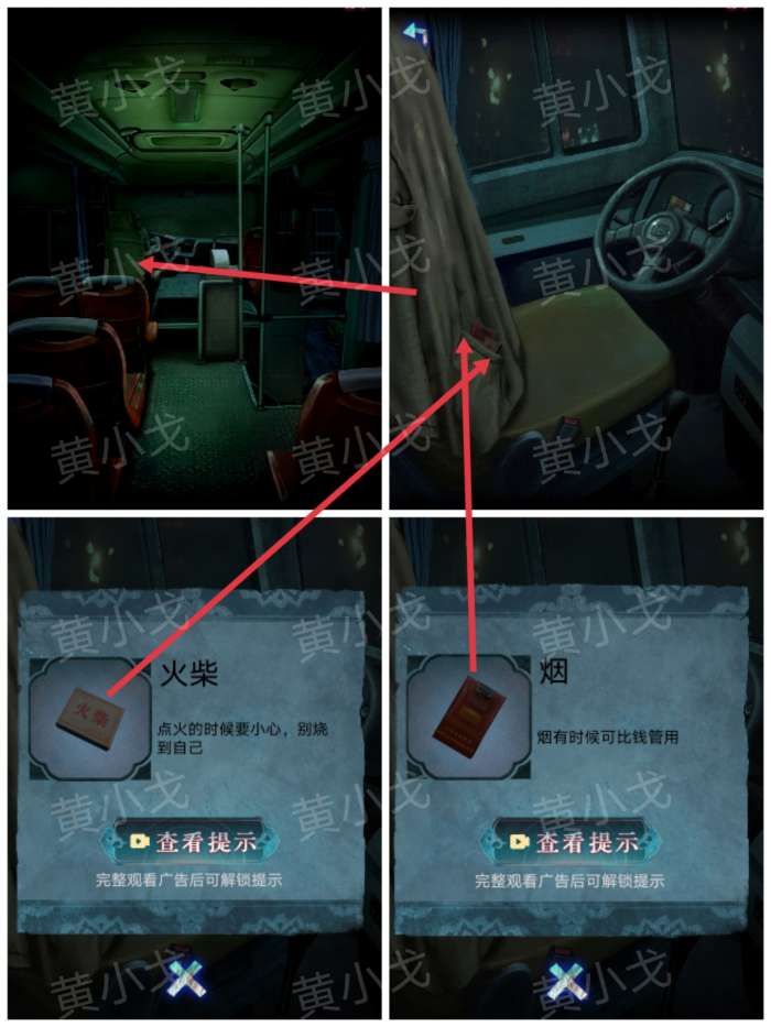 3.进入大巴车,点击驾驶位,在外套口袋里获得【火柴】和【烟】