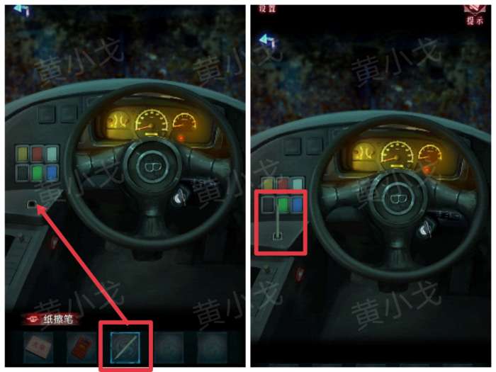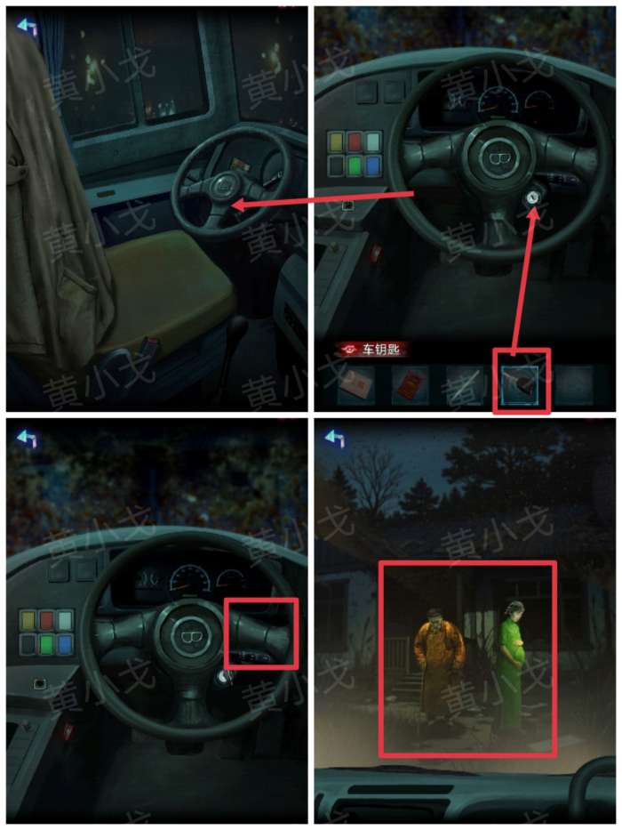 13.点击方向盘,用【车钥匙】启动车,打开车灯,查看前挡风玻璃上的纸人,获得线索