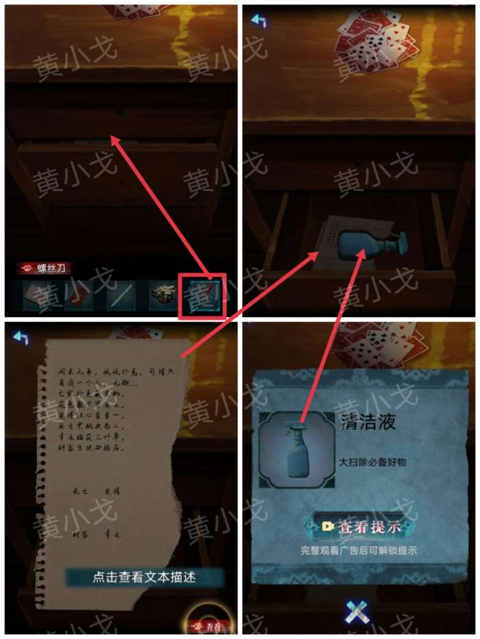 9.用【螺丝刀】撬开抽屉,获得【清洁液】,查看纸条内容