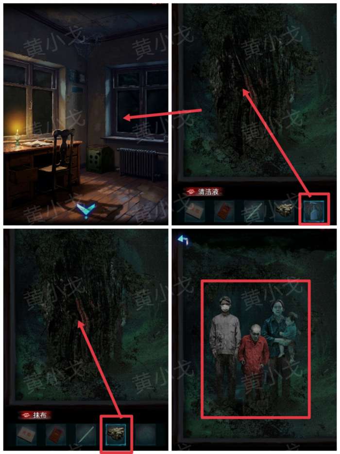 10.点击右侧玻璃窗,用【清洁液】和【抹布】擦掉上面的污渍,获得纸人线索