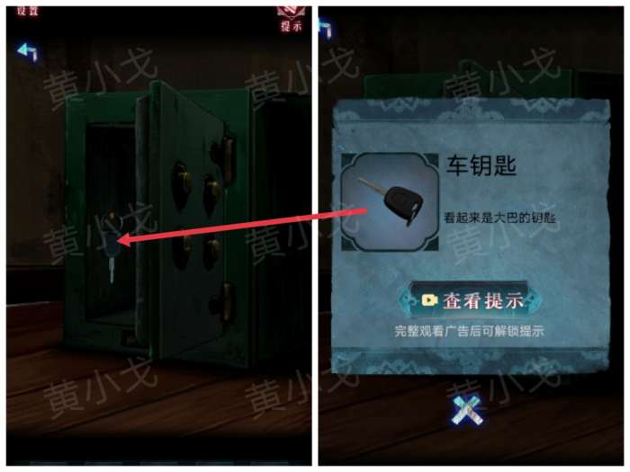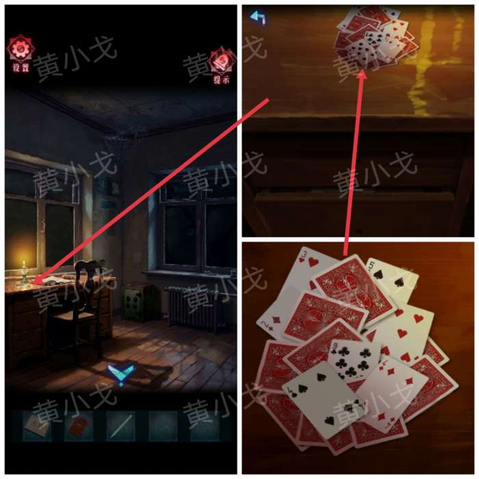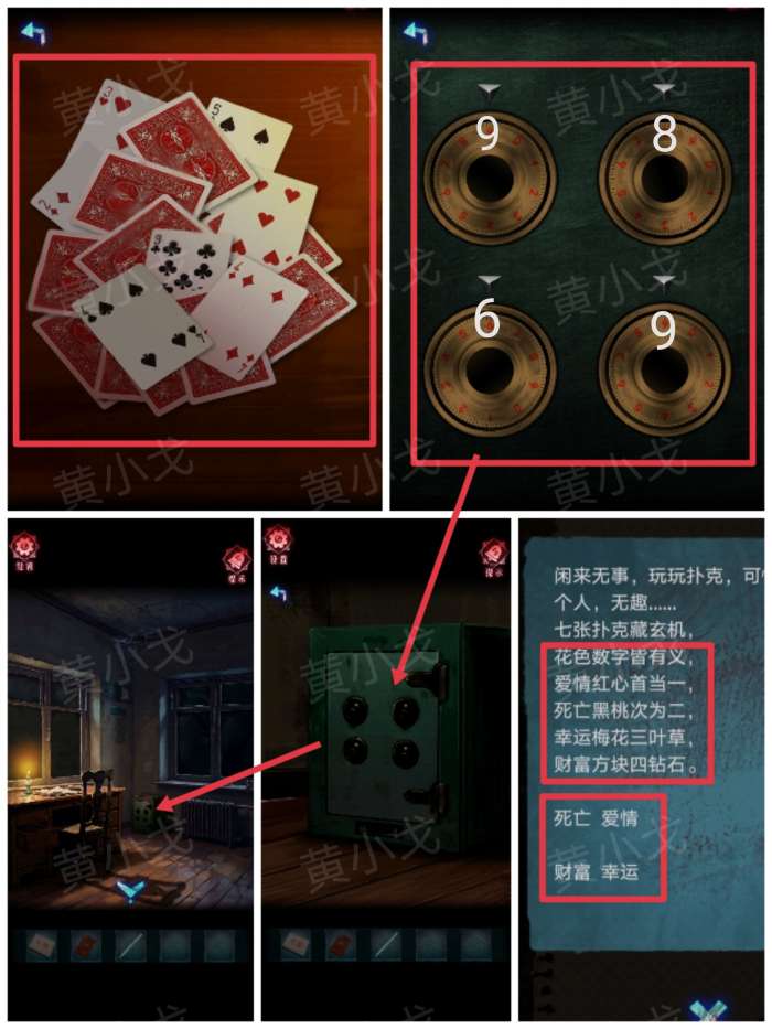 11.点击保险柜上的密码锁,根据纸条和扑克牌上的线索,调整密码锁