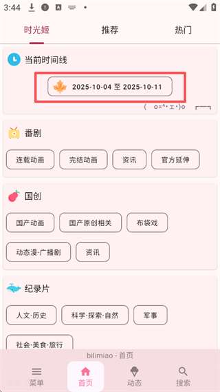 哔哩喵app时光姬怎么设置,首页时间线显示部分点击进入设置时间范围,进入时间设置之后,有三种模式可以选择,设置时间后,在首页选择对应分区,即可查看所选时间范围的热门视频。