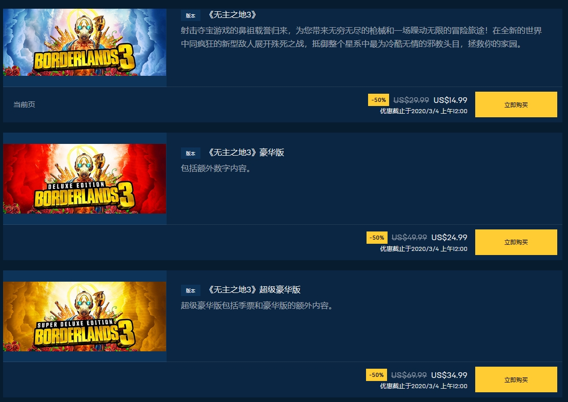据悉,此次Epic商城《无主之地3》所有版本开启了半价促销活动,季票也有8折优惠,其中《无主之地3》标准版14.99美元(原价29.99美元),《无主之地3》豪华版24.99美元(原价49.99美元),《无主之地3》超级豪华版34.99美元(原价69.99美元),《无主之地3》季票19.99美元(原价24.99美元)。此次优惠截止日期为北京时间2020年3月4日上午12点,现已正式开启促销活动。