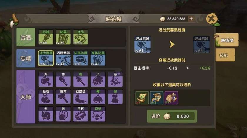 武器熟练度对我们是有增益的,从上图我们可以看到我们是可以进行进阶的,进阶之后暴击概率会有一个提升,也就是说我们的输出会变高,那么就可以这样理解武器熟练度对于我们的作战能力是息息相关的。