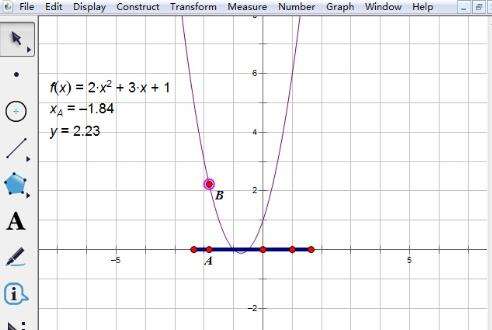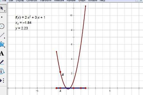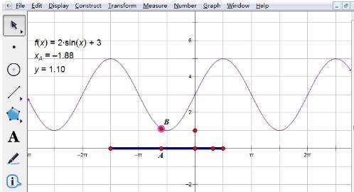 这里还是利用上面举例的函数,画出函数图像,先使用“线段直尺工具”在x轴上取一线段(作为定义域),选中线段执行“构造”—— “线段上的点”命令在线段构造点A,度量该点的横坐标xA、计算出y的值,执行“绘图”——“绘制点”构造点B(xA,y);