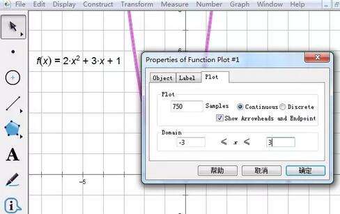 选中x轴上的点A和点B,执行“构造”——“轨迹”命令即可,这样就得到了在以线段作为定义域的曲线,将原来的函数图像隐藏,就得到了部分函数图像。