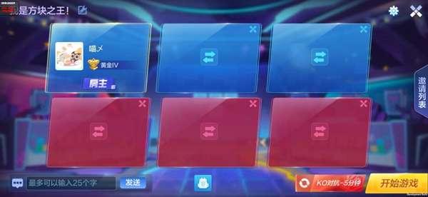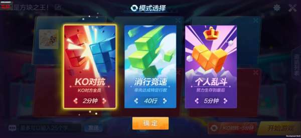 KO对抗模式中,玩家可以对战的时长(2分钟,5分钟,10分钟),并选择红蓝阵营中的一方加盟,进入房间后开启3V3对抗。当一方玩家攻击敌方玩家,使其优先一步将方块堆叠到顶部后,就可取得最终的团队胜利。