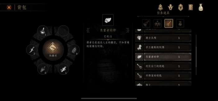帮助里有负重者怜悯的介绍,不过具体效果也没详细写,这游戏没说明的多了,怪物伤害降低50%,降低难度的道具