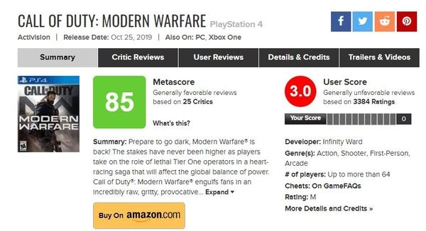《使命召唤:现代战争》自发售后,获得了广大玩家一致好评,当前在MC上的媒体平均分达到85分,是今年来该系列评分最高的作品,也登上了英国游戏销量周榜。可惜,俄罗斯玩家并不买账。