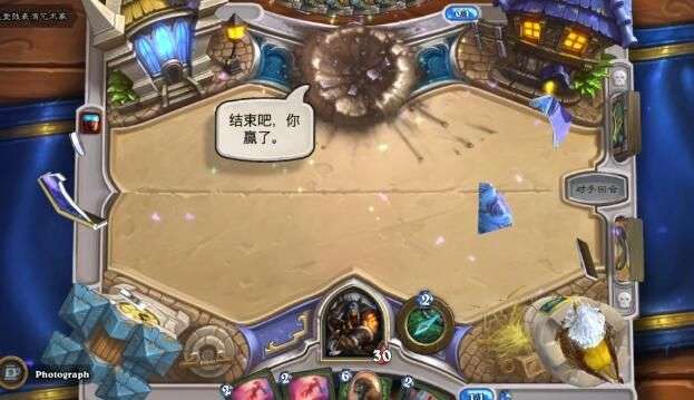 命运的对决终于还是到了,第三局我们也遇到了一个猎人,大战一触即发!事实证明对面猎人的卡组有些许的花里胡哨,光是冰冻就带了两个而且法术卡牌居多。虽说前期打了我一定的血量,但只要我们狮子一下场基本上就成了一边倒的局面。而且由于对手的法术卡牌多,因此在场面上和手牌上都差了我们不止一点半点。