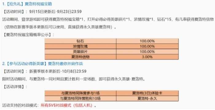 活动期间,登录游戏即可获得夏洛特祝福宝箱*1,打开必得必得英雄碎片*1、浓情玫瑰*1、钻石*15,有几率获得夏洛特信物(信物在新赛季版本更新后可以使用,直接获得永久英雄夏洛特)。