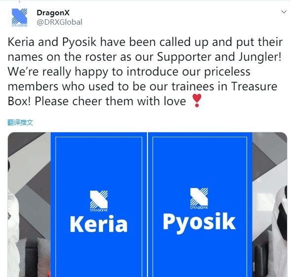 LCK赛区的DragonX战队在12月4日的直播中官宣了前Griffin战队上单选手Doran与中单选手Chovy加盟的消息。同时宣布的还有来自青训的天才辅助Keria与打野Pyosik。DRX战队的全新阵容至此基本成型。