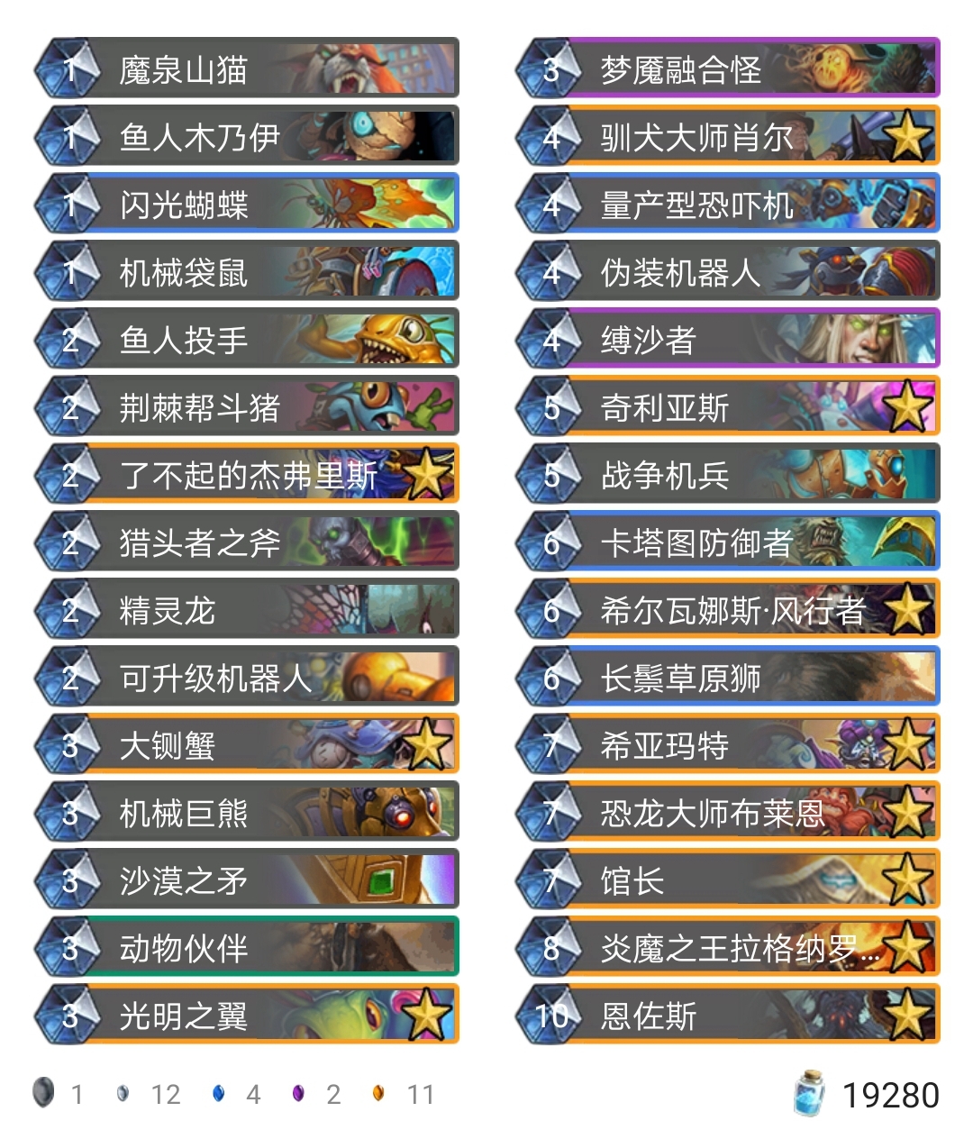 先对单卡做一波解释:1.之前我是带御猫的,但是玩着玩着我发现我经常用姐夫去找杀手蟹,鱼人骑对局和萨满对局都有找,于是把御猫换成了杀手蟹,打萨满能杀个121血赚至少三个回合节奏吧