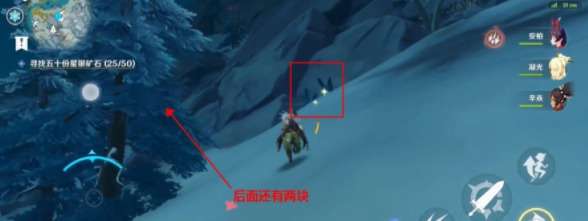 第二处则需要沿着山脚往左边方向走,当看到一个冰霜丘丘人法师的时候,往上到山壁交接的地方,就可以找到四个矿石,打碎可以拿到4块左右。