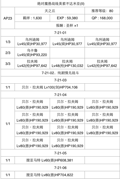 7-21-5和7-21-6的敌人为提妈。作为BeastII同样也是全部等倍率。拥有技能:“单独显现” 解自身弱体+我方强化 解除,“创世纪” 对于人和星阵营全体宝具封印3回合,“超怪力” 攻击力提升1回合,“生命之海” 增加5格气,“青色的星之瞳”我方星星发生率下降2回合,“赤色的星之瞳” 诅咒2回合,“幽暗的星之瞳” np获得下降2回合。宝具为“吾儿,遵从创世之理” 全体攻击+强化无效1回合赋予