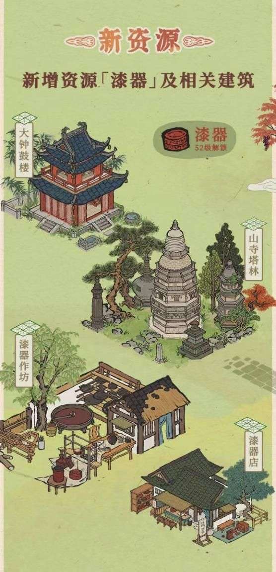 玩家可以通过游戏中漆器资源、严大人、盐商、土行孙等玩法免费解锁,用它们来点缀你的江南小镇吧!