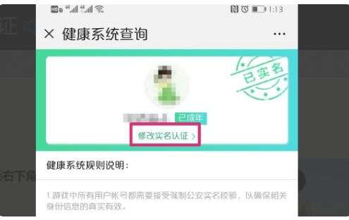 7、进入健康系统查询界面,点击微信头像下面的修改实名认证。