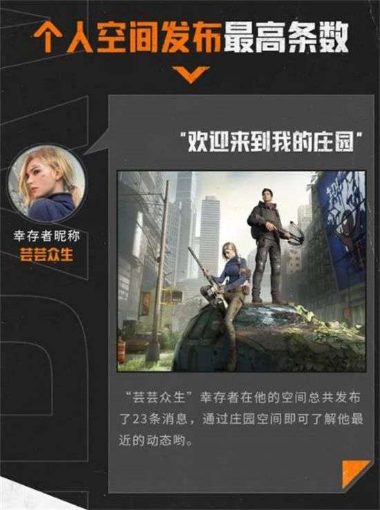 大赛点评:“芸芸众生”幸存者在他的空间总共发布了23条消息,通过庄园空间即可了解他最近的动态哟。