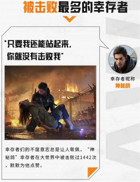 大赛点评:幸存者们的不屈意志总是让人敬佩,“神秘鸽”幸存者在大世界中被击败过1442次,默默为他点赞。