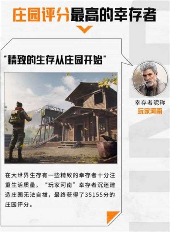 大赛点评:在大世界生存有一些精致的幸存者十分注重生活质量,“玩家河南”幸存者沉迷建造庄园无法自拔,最终获得了35155分的庄园评分。