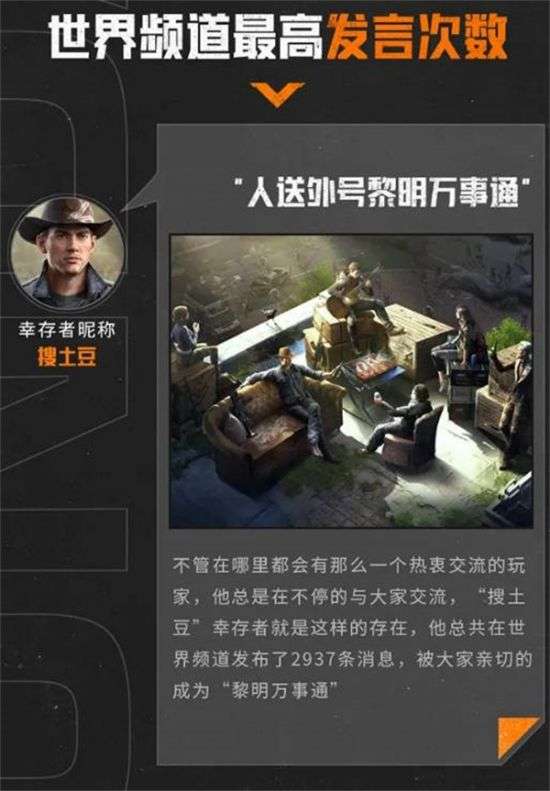 大赛点评:不管在哪里都会有那么一个热衷交流的玩家,他总是在不停的与大家交流,“搜土豆”幸存者就是这样的存在,他总共在世界频道发布了2937条消息,被大家亲切的成为“黎明万事通”