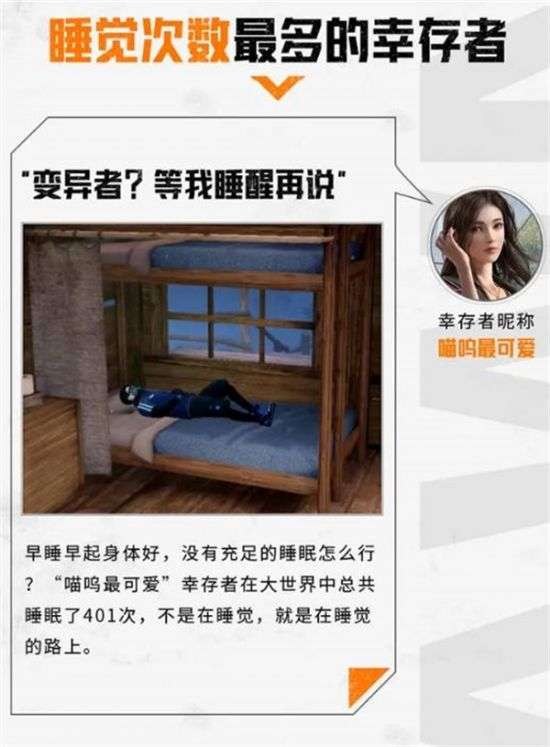 大赛点评:早睡早起身体好,没有充足的睡眠怎么行?“瞄呜最可爱”幸存者在大世界中总共睡眠了401次,不是在睡觉,就是在睡觉的路上。