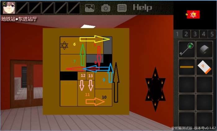 13.点击前方门旁边的密码器,发现华容道谜题。【木片】的颜色与之相同。首先注意到某个木片有六芒星图案,观察M2地图,这些木片的形状与M2地图的房间是一一对应的。则将华容道拼成A字,再插上【木片】即可完成谜题。前方门的门锁解除,进入【地铁站·西进站厅】。