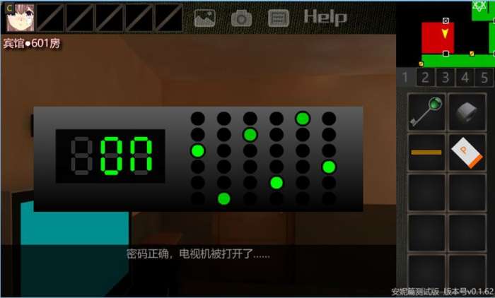 8.后退,右转,点击电视机上面的机顶盒,点击灯可以变换灯在该列的位置,经过反复尝试后发现,当横纵斜均只有一个灯时,灯就会由红变绿。所以这个谜题是“四皇后谜题”,使横纵斜的线上均只有一个灯即可完成谜题(随机!由于第一列、第二列被锁定,解法唯一),电视机打开。