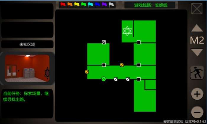 15.华容道形成了一个A字,恰好是M2的地图。注意到华容道的木片还可以摁下去。按照现在地图被开启的房间去点击,(至少打开过5个房间才能够开启机关,所以需要提前打开被电视机解锁的房间)触发机关。