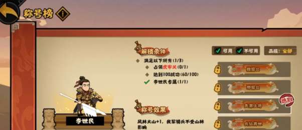 接着就是全新的战功机制,这就是壮大队伍的一个主要关键。武将无论是杀敌还是打仗,又或者是单挑立了功,全部都可以积累战功。等到战功积累一定程度之后,就可以给特定的武将直接去解锁称号。这些称号还会拥有一个属性加成,例如可以解锁李世民的专属称号,一旦在解锁之后就可以增加风灵火山属性。让我方的骑兵不会受到山林地形的影响,对于骑兵来说简直就是一个福音。