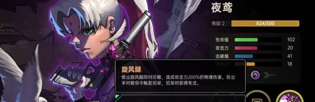 夜鸢定位为中远距离持续火力型角色,主武器为高射速、高单发伤害的枪炮系统。其核心输出依赖技能连段触发的多段爆发,配合短前摇特性,可在瞬息间完成多轮精准打击。但需注意:该角色基础防御属性偏低,缺乏近身格挡或反制手段,一旦被敌方突进至贴身距离,生存压力陡增。因此,合理把控安全输出位、善用二段跳与横向位移规避控制技能,是发挥其上限的关键前提。