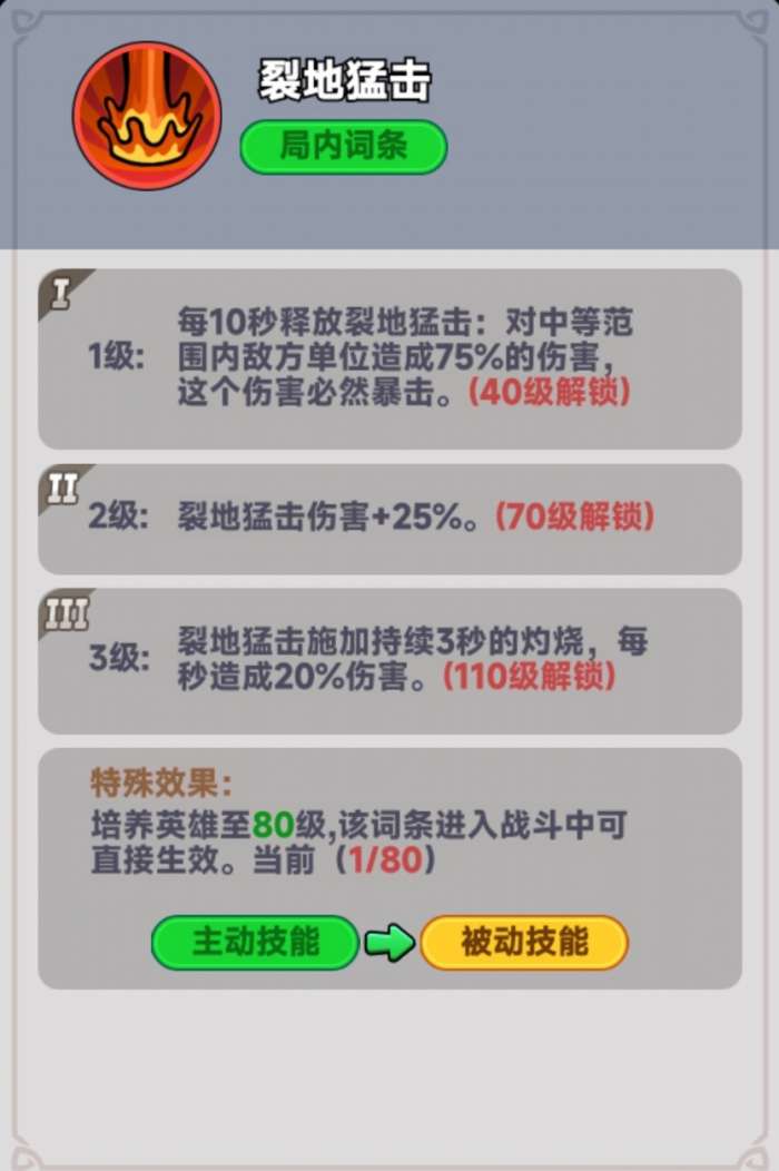 三技能:裂地猛击,主动战法,每10秒释放一次技能,造成范围伤害,不过该伤害能造成暴击,伤害效果极高,而且技能达到二阶伤害再次1.5倍,不过要70级,诶不对,我为什么要考虑氪佬有没有钱氪的问题。