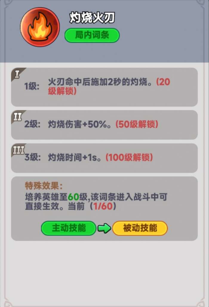 二技能:灼烧火刃,一二技能联动,一技能命中目标后造成一次2秒灼烧(理解为燃烧效果即可),灼烧伤害不高,但等级提升到一定程度还是很不错的。