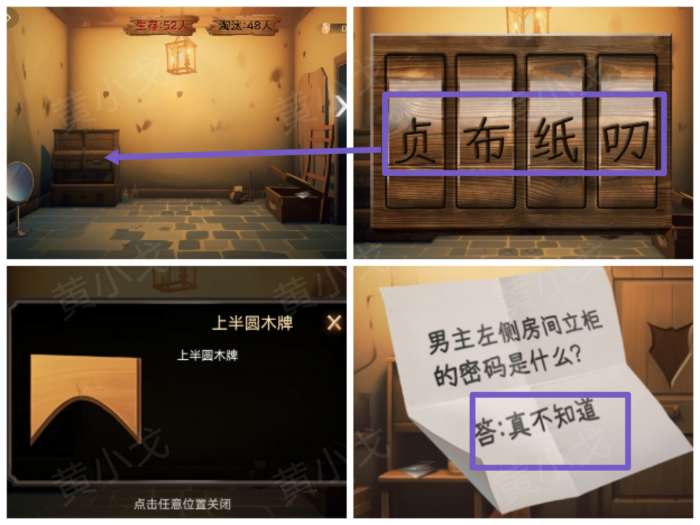 6.点击立柜上的密码锁,根据女主那边的线索,输入密码:贞布纸叨;打开柜子,获得【上半圆木牌】