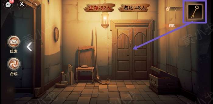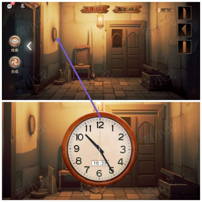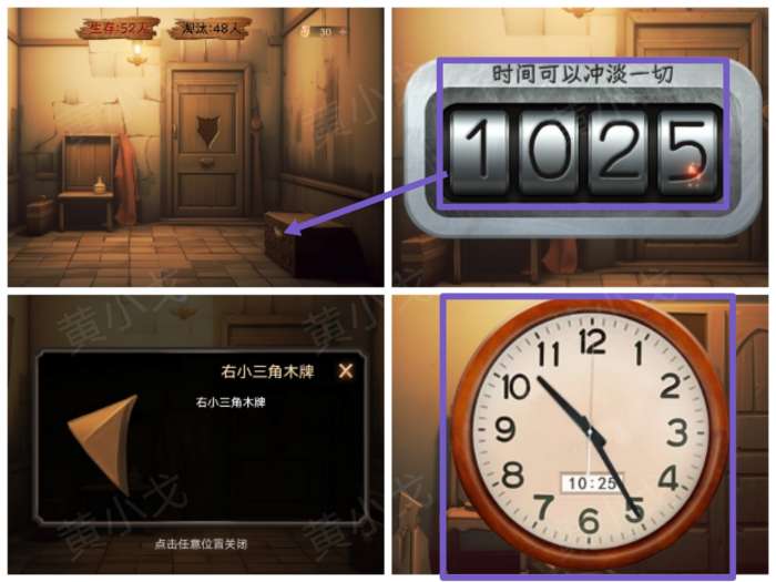 3.点击地上的箱子,根据上面的提示,结合男主那边的时钟上的线索,输入密码:1025;打开箱子,获得【右小三角木牌】