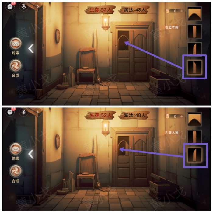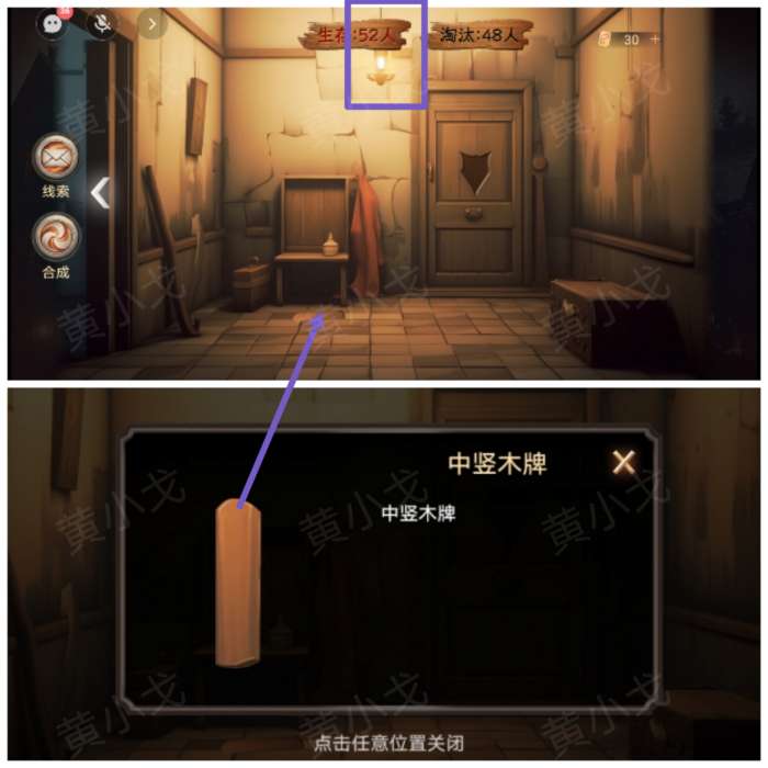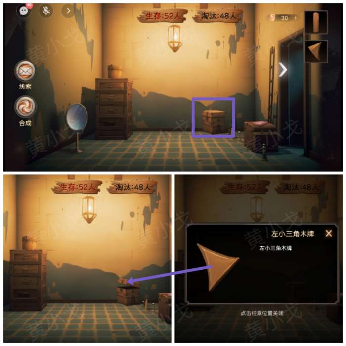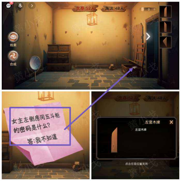 5.打开箱子,获得【左竖木牌】;查看纸条内容,获得线索,告诉女主