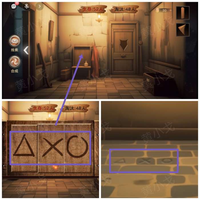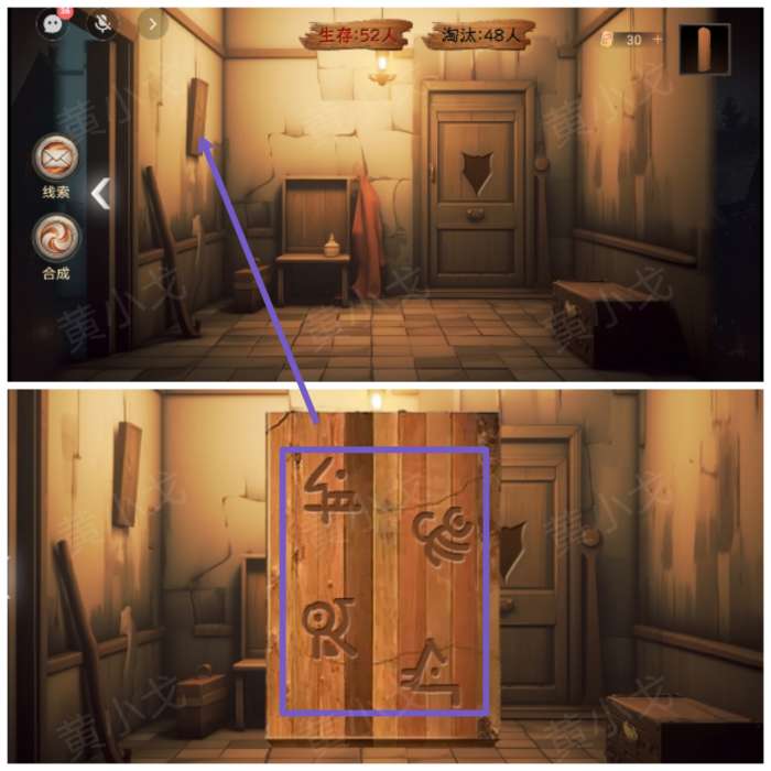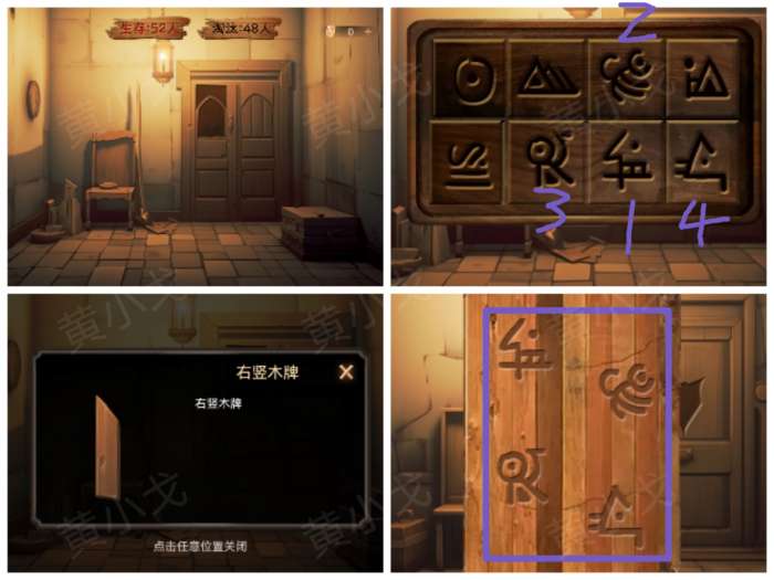 2.点击地上的箱子,根据女主那边的线索,按顺序按下正确的符号按钮;打开箱子,获得【右竖木牌】