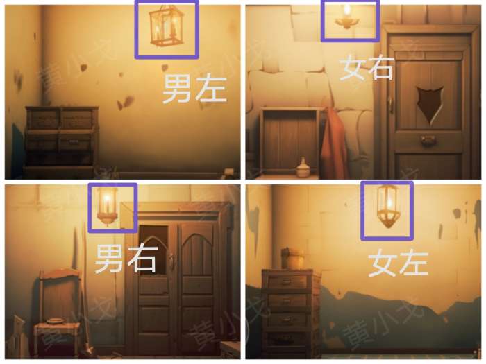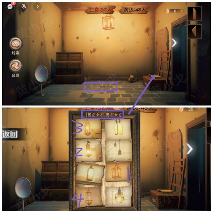 4.点击地上的箱子,根据上面的文字提示,结合双方房间吊灯形状线索,按顺序按下正确的图片