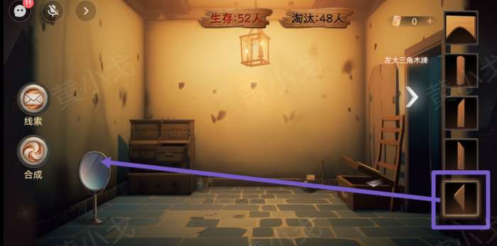 8.点击五斗柜上的密码锁,根据男主那边的线索,输入密码:卧布纸叨;打开柜子,获得【右大三角木牌】