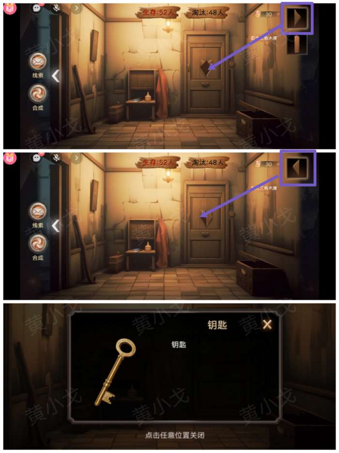 10.把【左小三角木牌】、【右小三角木牌】、【右大三角木牌】和【左大三角木牌】放到大门拼图上,获得【钥匙】