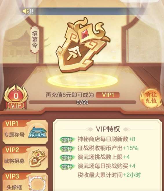 为了能让玩家有更多的选择,里面会有新手成长活动,只要是新手玩家就能参与全新登陆礼包,在这个利益包中,能获得很多初期的资源,另外还会有招募令充值玩法,玩家可以充通过充值6元提升自己的VIP等级,等级变高之后,除了获得专属的称号之外,还有机会招募更多强力的名将或者是,让自己每天的经验产出以及各种铜币产出都能得到提升。