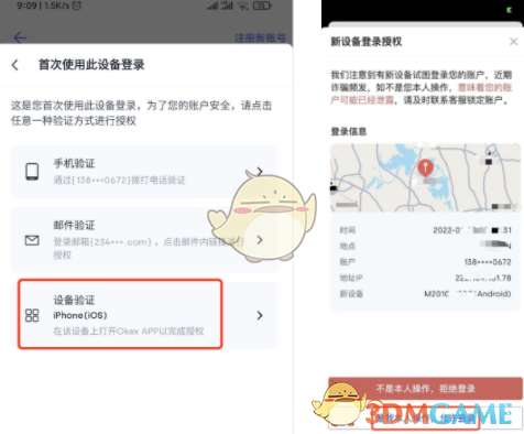 1、若选择设备验证,打开您已用设备(如iPhone)上的欧易APP,会收到验证内容,点击【是我本人操作,允许登录】即可。