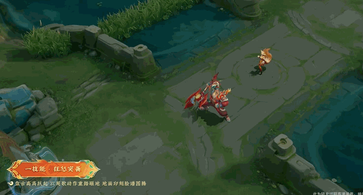 一技能:盘古高高跃起,以英歌动作重踏砸地,地面印刻脸谱图腾;能量臂状态下,动作融合英歌舞步向前飞踢,带出流火残影。