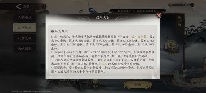江亭取物活动采用类似转盘的抽取机制,奖池内共设有10个不同等级的奖励。玩家首次抽取可免费进行,后续则需要消耗金珠才能继续参与抽奖。随着抽取次数的增加,每次所需的金珠数量也会逐步攀升,需要合理规划资源。